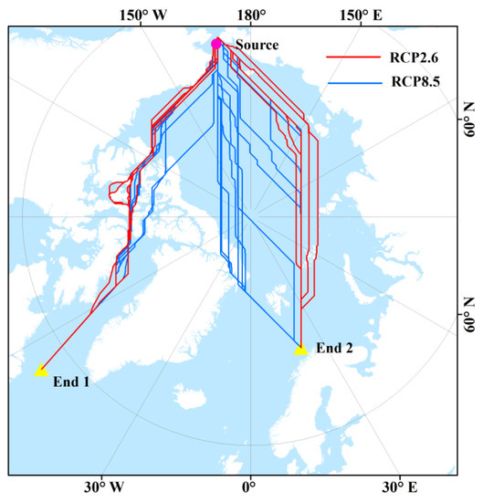 The minimum cost path from the Bering Strait to Baffin Bay and the Norwegian Sea in different months. Under RCP2.6, paths from Source to End 2 are paths of the PC6 vessel from July to January. Paths from Source to End 1 are paths of PC6 from July to December. In RCP8.5, paths from Source to End 2 are paths of the OW vessel from August to October and paths of PC6 in other months. Paths from Source to End 1 are paths of PC6 all year round.