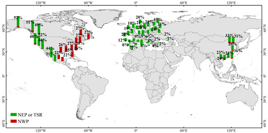We analyzed the trade via ASRs from China to Europe (EU) and North America (NA) under RCP2.6 (Figure 5) and RCP8.5. The trade was calculated for 12 months of the year. We found that trade via ASRs from Europe to the west coast of NA was the most frequent. The most common trade path of the ASRs from EU to the west coast of NA is the NEP or TSR. The most common trade path of the ASRs from China to the east coast of NA is the NWP. The most common trade path of the ASRs from China to EU is the NEP or TSR. As the port is located to the north, a higher trade percentage was shipped through the ASRs. In RCP2.6, about 11–17% of the trade via ports in China occurred using ASRs for transport. About 1–10% of the trade via ports in EU occurred using ASRs for transport. About 10–14% of the trade via ports on the east coast of NA occurred using ASRs for transport. About 10–26% of the trade via ports on the west coast of NA selected ASRs for transport. The highest percentage of trade via ports along the ASRs could be up to 26%.
