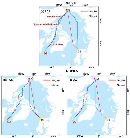 Thus far, to verify the rationality of the model, we compared the shipping routes of the OW and PC6 vessels via ASRs in our simulation (Min_cost) with the simulation results of Melia et al. (2016) [18] at the end of the 21st century. At the same time, we compared the paths of the ASR based on the minimum shipping time model (Min_time) with the results of Melia et al. (2016) [18] (Figure 7). The simulation of Melia et al. (2016) [18] also used the shortest shipping time to plan routes. Their simulation selected five general circulation models (GCMs). Each GCM contains three ensemble members in its simulation. Their simulation offered all possible results for each GCM at the end of the 21st century. In Melia’s [18] simulations, the following results were noted: