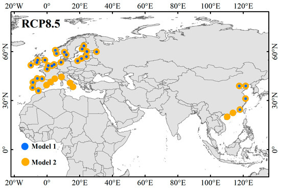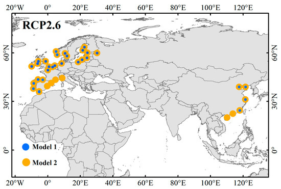 To illustrate the importance of transportation cost while considering the new paths of the ASR, we compared the scope of ports via the ASRs from China to Europe based on the cost model of this study and based on a transportation cost model that takes no consideration of the new paths of the ASR. When the cost of using ASR is lower than that of the traditional sea routes, we assume that the port may select the ASR for transportation. In Figure 8 and Figure 9, Model 1 represents the transportation cost model taking no consideration of the new paths of the ASR, and Model 2 represents the transportation cost model considering the new paths of the ASR. Both simulations of the two models are based on sea ice thickness under the same RCP scenario. In both RCP2.6 and RCP8.5, the region in EU further from the Arctic than Portugal will not transport to China via ASRs. Additionally, ports in China further from the Arctic than the Xiamen port region will rarely transport to Europe via ASR. However, in Model 2, the region farther than the north coast of France will not transport to China via ASRs in RCP 2.6. The region farther than Italy will not transport to China via ASR in RCP 8.5. Additionally, all the ports in China will transport via ASRs. This is to say that more trade demand will be placed on ASRs than expected when the ASRs open.