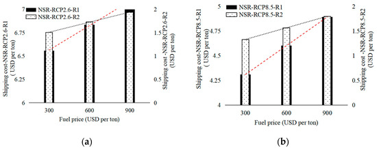 The cost of shipping paths is a dominant factor of trade among regions. Fuel prices are a major uncertainty of the shipping cost. We analyzed the sensitivity of fuel prices in the transportation cost via ASRs (Figure 10). We selected the shipping cost of PC6 to analyze the sensitivity of fuel prices because the PC6 vessel can ship through ASRs in both RCP2.6 and RCP8.5 scenarios. From Figure 10, we can see that the shipping cost of R1 (from the Bering Strait to the Norwegian Sea) is more sensitive to fuel prices. The increasing shipping cost rate of R1 is about 1.2 times the shipping cost of R2. Furthermore, the shipping cost in RCP8.5 is more sensitive to fuel prices than that in RCP2.6. The increasing shipping cost rate in RCP8.5 is about 1.1 times the shipping cost in RCP2.6. However, the changing percentage of shipping cost is less than 10% when fuel prices increase from USD 300 to 900 per ton.