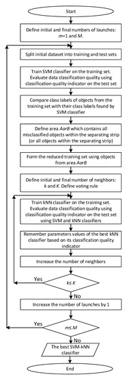Papers [52,53] proposed and discussed a two-step SVM-kNN classification approach, which applies the joint sequential application of SVM and kNN classifiers. In the first step, the SVM classifier is developed on the basis of the initial dataset. Then, the region that contains all of the misclassified objects is determined. Misclassified objects of this region and properly classified objects that fall into this region form a new dataset. In the second step, the kNN classifier is developed on the basis of the reduced dataset, which is formed from the initial dataset, from which the objects of the new dataset are excluded. Then, the kNN classifier is applied to classify all objects of the new dataset. If the classification quality of objects belonging to the new dataset is improved, the two-step SVM-kNN classification approach can be used to classify new objects. The parameter values of the SVM classifier can be set by default or fixed a priori. The parameter values of the kNN classifier are determined experimentally. The limitations on the applicability of two-step SVM-kNN classification approach are as follows: due to the large width of the found region or excessive crowding of objects from the initial dataset within this region, the number of objects in the reduced dataset may be insufficient for kNN classifier development.