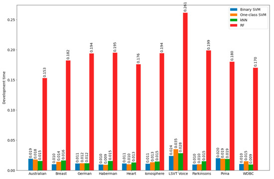 It should be noted that the use of the evolutionary optimization algorithm can significantly reduce the time spent on development of binary SVM classifier (compared to the time spent on development of binary SVM classifier using the grid search algorithms). However, even these time costs can turn out to be significant when working with complex multidimensional datasets of large volumes, which can be considered as big data.