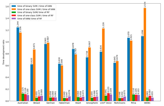 The level of class balance in the dataset used during the development of the classifiers has a significant influence on the data classification quality. It is known that probabilistic classifiers are feebly dependent on class balance. However, improbable classifiers, for example, SVM classifiers, are negatively affected by class imbalances [54,55].