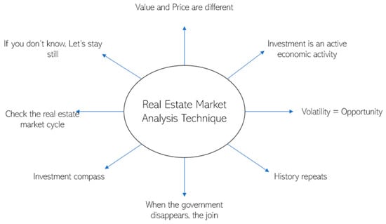 There is also a method of analyzing the real estate market through data quantification [12], but the analysis method introduced in this related paper aims to explain how to make the real estate market analysis desirable through eight factors. The first is to check the cycle of the real estate market. In the real estate market, government policies, domestic and international economic conditions, and demand and supply aspects have a greater impact on price fluctuations than other factors. Looking at the history of the real estate market in Korea, it has been repeatedly rising and falling. Analyzing the real estate market doing so, it would be desirable to understand when prices rise, and when to adjust and invest. Second, when a new government is in place, the Presidential Commission on Acquisition of Office has the task of setting a new policy stance. It is important to check whether the regulation of real estate policy will be strengthened or relaxed by checking the state roadmap. The third point is similar to the second. If the government continues to use the real estate market stimulus, the land price will naturally rise, such that, if the government induces to buy it, one needs to buy it. Fourth, it is necessary to examine the past trends in the history of real estate, because the regulatory policy was strengthened and then relaxed from 1960 to the present. Fifth, since the real estate market policy regulation and stimulus are repeated in a pattern, it is necessary to invest conservatively during the regulatory period and aggressively during the stimulus period. The sixth point is to view investment as an active economic activity as a defensive measure to prevent the current assets from being thrown away. Considering the ever-increasing inflation rate, investment is necessary because the purchasing power of the product may become zero someday if you deposit assets in a bank without carrying out any investment. The seventh point is that value and price should not be viewed at the same time. If you do not make an investment which exceeds the inflation rate, you will lose money; thus, it is necessary to actively invest. Finally, if you are investing in the real estate market, it is better to stay still unless you know anything [13]. As mentioned earlier, there is a method of analyzing the real estate market by approaching it with data and expressing it by quantifying it, but empirical factors can also be an analysis and collection factor. The following Figure 1 shows the eight factors of the real estate market analysis technique.