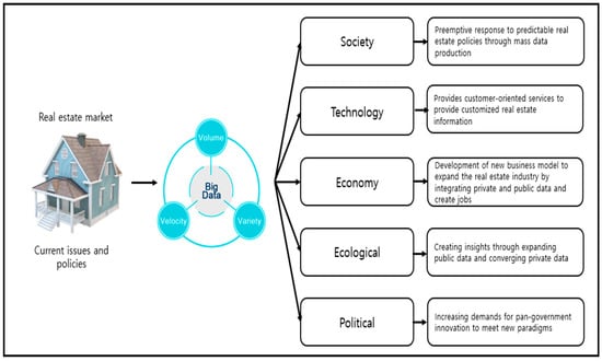In the real estate market, Big Data is a suitable technology for approaching current issues and policies. It is believed to be able to support real-estate–related activities through the use of Big Data, and to respond to future problems through future prediction [28]. Therefore, real estate Big Data should be derived to reflect the various factors comprehensively and proceed to the best process. Currently, the Korean market is preparing for difficult or unpredictable situations, such as going back and forth between cold and hot water like riding a roller coaster. It is expected to be effective in solving the problems for the purpose. Therefore, it is necessary to find a way to graft into the real estate market by referring to the use cases of Big Data technology and recent trends [14]. Figure 3 shows the real estate Big Data in the STEEP (Social, Technological, Economic, Ecological, and Political) type.