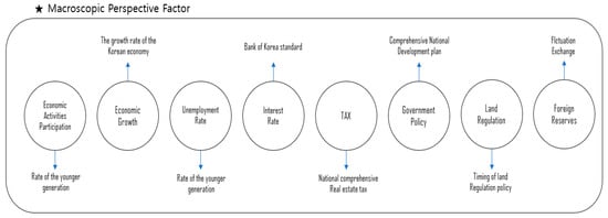 The real estate market belongs to a typical area in which it is difficult to predict the ‘after’ situation. As a result, even experts agree that the area of interest is likely to skyrocket. There are various factors for investigating the ‘after’ of real estate, in addition to macro and micro variables [29]. In this paper, however, we examined the factors for forecasting real estate land prices through macro variables and micro variables. If we look at the entire real estate market over the long term, the macro perspective has a great influence. Likewise, in the short term, the micro perspective has a high impact. Nonetheless, it is necessary to consider both, because their effects may be intertwined. Therefore, the research focused on two factors in the ground prediction.