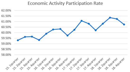 Currently, as Korea approaches the age of ultra-aging like its neighbor, Japan, the population of the elderly is increasing, and the proportion of the youth is decreasing. Nevertheless, as of 2018, the value of the real estate market is not falling, but is currently on the rise. As such, what is the biggest reason the land price is not falling when the fertility rate is decreasing and the economic situation is not as good as it was in the past? The value of the real estate market cannot depreciate because they are entering the real estate market due to the increase in the number of young adults owing to the baby boomers from the early 90s to the mid-90s. When the fertility rate reaches a number similar to the present by the 2030s beyond the 2020s, the analysis of statistical institutions confirms that house prices will change significantly from the present. As a result, from a macroscopic point of view, the future situation is not good. The following Figure 6 shows the participation rate of young adults in economic activities, where young people are between 15 and 39 years old.