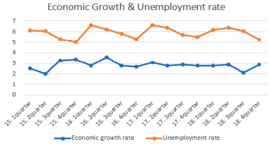 As the economy grows, the value of stocks, real estate, and existing goods rises as inflation progresses rapidly when people’s income and corporate capital investment increase [38]. If the economic growth rate decreases compared to the present, the demand for and value of real estate and stocks will decrease. Moreover, as the income and corporate investment of the people decrease, the growth rate decreases as the number of sales providers increases. Figure 7, below, shows the figure of the economic growth rate, which means the rate of GDP (Gross Domestic Product) growth, and the unemployment rate for 15 to 39 year-olds.