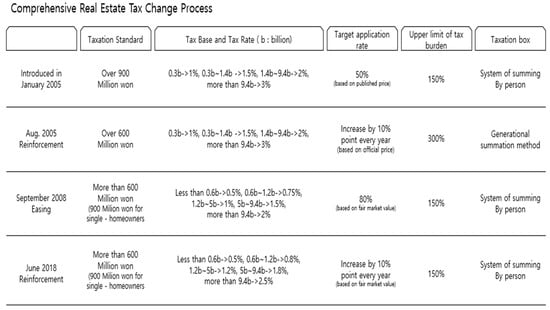 - National Tax Service. Comprehensive Real Estate Tax. Available online: https://www.nts.go.kr/ (accessed on 28 March 2021).