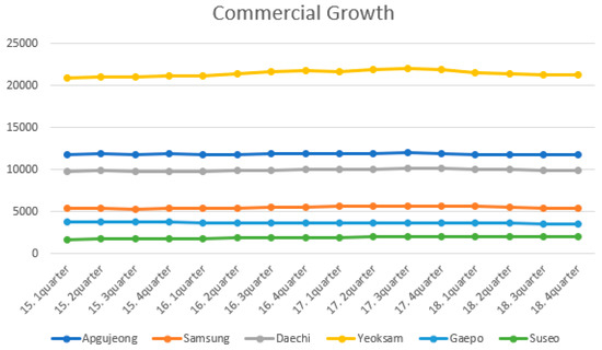 As the commercial area grows, if the land or building in the area is owned, the profit gained from the rental income or land transaction becomes relatively large. There is a need to be cautious when the existing holders pay for everything and sell all of them at high prices when trading with the right to name the premium commercial zone. Among the commercial districts in Seoul, the most popular commercial districts are Hongdae, Sinchon, Hanyang University, and Keonkuk University, but not all of the commercial districts are growing. Although it plays a part in the flow of traffic, factors which promote the growth of commercial areas are needed. As an example, Hongdae’s commercial district has a growing population, unlike other commercial districts. The reason the Hongdae commercial area is gradually growing is that it is expanding into Donggyo-dong, Yeonnam-dong, Sangsu-dong, and Hapjeong-dong, and the charm of the old and new generations overlaps with Korean and exotic ones. As a result, commercial areas grew in the past as residential areas turned into clothing stores and restaurants. The second attraction of the Hongdae area is creative diversity. As shown by the recent SBS (Seoul Broadcasting System) entertainment Jong-won Baek alley restaurant, we can find different charms in the Hongdae area, too, as each block has a new charm. Transportation and important facilities are indicative of the growth of the commercial area, but it can be seen that the attractive part can also promote the growth of a commercial area [39]. Figure 14 shows the variation in the number of stores in each living zone.