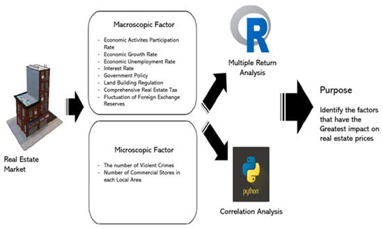 Real estate market analysis can be a process of providing necessary information on real estate policy and administrative support by analyzing the market, in which prices are determined by the supply and demand of real estate. At the core of the analysis of the real estate market can be the research and analysis of various factors, such as the factors that form supply and demand, and their changing societies, economies, and policies. In addition to the macro and micro environment variables seen in the current paper, the analysis of changes in economic conditions, industrial structure, climate, and global markets that affect demand requires regional character and spatial congestion. The analysis of the location of the area and the regional market is required because the subgroups that have are born. Therefore, the factors that determine real estate prices are diversely distributed, such as psychological, social, policy, economic, individual, and regional factors [7,8,9,10,11].