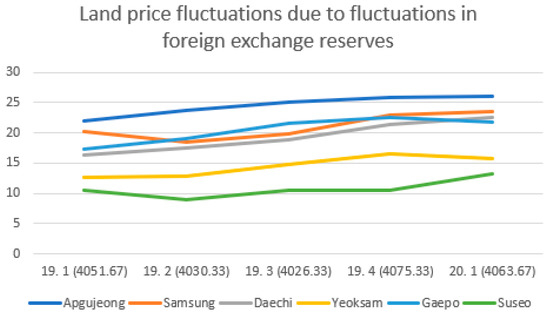 Through the R program regression analysis and the correlation analysis of Python, it was confirmed in Section 4.1 and Section 4.2 that the most relevant factor for the land prices is the foreign exchange reserves. Next, we sought to analyze the fluctuations in foreign currency reserves and the relationship with land prices from 2019 to the present, and to investigate how the influence is applied as it is.