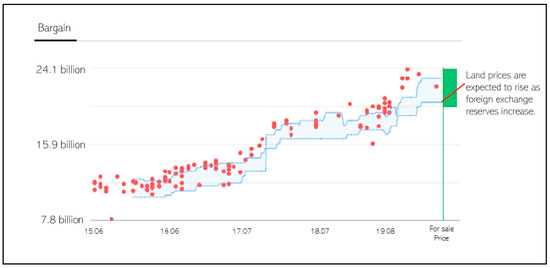 The foreign currency reserve was set as an independent variable through a Python program. The representative apartment area in the living area of each region was set as the dependent variable. The results were then confirmed through correlation analysis and regression analysis. It was confirmed that, among the six regional living areas, the representative apartments in the regional living area of Samsung have a significant relationship with the fluctuation of foreign exchange reserves. The correlation was also confirmed. In addition, the fluctuation of foreign currency reserves was confirmed to be related to the land prices of each regional living area. Unfortunately, the real estate transaction is active, and it was set at 120 square yards, so there was not much data, and the relevance between foreign currency reserves and land prices increased. However, other studies confirming fluctuations in foreign exchange reserves and their relationship to the stock market have confirmed that an increase in the amount of currency has led to overinvestment in real estate and the stock market, leading to price increases [41,42]. Foreign exchange reserves in the first quarter of 2020 showed a decline due to the increase in the dollar due to the foreign exchange market stabilization measures and COVID19, but has been on the rise since. Korea’s foreign exchange reserves at the end of December last year were $443.1 billion, an increase of $6.7 billion compared to November, indicating that securities will also have a significant increase in return on investment, and that real estate land prices will also rise significantly. This research also confirmed the data of 2019 using the data of 2015 to 2018, but for this research, it was also confirmed that the fluctuation of real estate land prices due to the fluctuation of foreign currency reserves has a correlation [42,43,44]. The result of this can be valid. Figure 20, below, shows the transactions for a representative apartment in 120 square yards in the Samsung area of Gangnam-gu, where the blue line denotes the quotes for the apartment. The red dot shows the actual transaction price. The green line shows the current price of the property, and the red line at the end is the speculation that the market price will rise due to the increase in foreign currency reserves.
