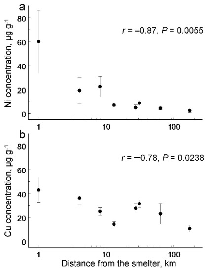 Concentrations (means ± S.E.) of the main metal pollutants ((a) nickel; (b) copper) in butterflies in relation to the distance from the Monchegorsk smelter.