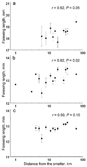 The forewing length in the three butterfly species similarly decreased toward the smelter (Table 3), being 5–8% smaller in the most polluted sites than in the unpolluted sites (Figure 4). However, the species-specific correlations between forewing length and distance from the smelter were significant only in B. euphrosyne and P. idas (Figure 4a,b).