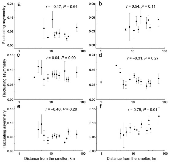 Fluctuating asymmetry (means ± S.E.) of two spots ((a,c,e) spot 1; (b,d,f) spot 2) of butterflies ((a,b) Boloria euphrosyne; (c,d) Plebejus idas; (e,f) Agriades optilete) in relation to the distance from the Monchegorsk smelter. For the identity of measured spots consult Figure 1.