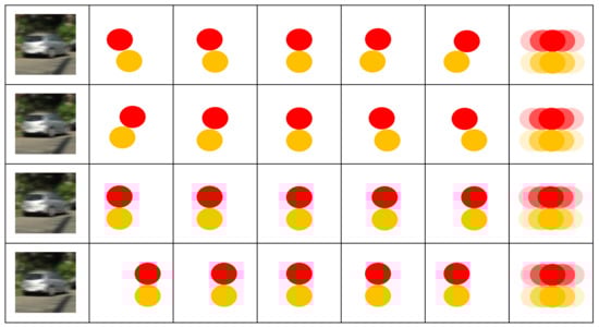Given a pair of images for analysis, the original image x and its corresponding target image y, they can be represented as sets of points, respectively: and . Set as the cosine distances between and . As X and Y are the most matching features, the value of must be smaller than the cosine distance of points from other features , and we assume those distances as . In the work of reference [], they defaulted to , but in practice, their values may be very close. For example, there are many worker bees on the hive in one image, and the features of worker bees may be very similar. If we apply the learned features to deblur directly, the network may confuse two worker bees who are close to each other. Hence, we add two restrictions to avoid the occurrence of error recognition and to ensure that .