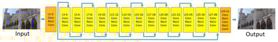 The configuration of the ResNet-based model. It consists of 2 convolution layers (L1, L2), 13 residual blocks, another 2 convolution layers (L27, L28) with no jumper connections and 3 extra (L29, L30 and L31) convolution layers. The residual blocks, represented by L(X) and L(X + 1), each contain 2 convolution layers, where “X” can take 3, 5, 7, 9, 11, 13, 15, 17, 19, 21, 23 and 25 of these residual blocks.