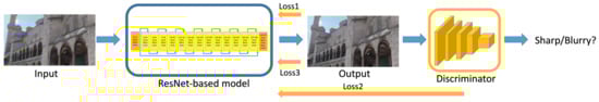 The GAN-based framework for extracting a sharp video sequence. The whole network architecture is composed of one discriminator and one generator. The generator is the ResNet-based model, whose architecture can refer to Figure 2. The discriminator is a VGG-like CNN, which consists of 16 convolutional layers and a two-class software layer. During the training stage, the pixel2pixel loss (loss1), adversatial loss (loss2) and contiguous blurry loss (loss3) work together to update the parameters of the ResNet-based mode.
