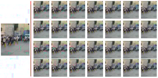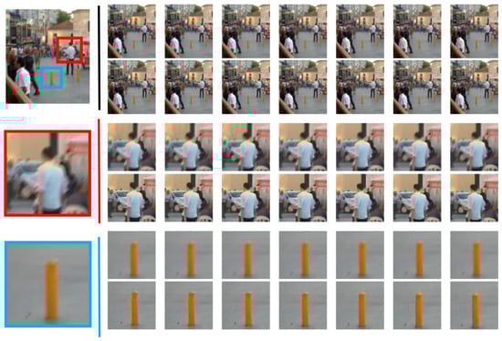 Video Blurred Database. Su et al. [] established a benchmark database which captures at 240 fps with multifarious equipment, such as the Canon 7D, GoPro Hero 4 Black, iPhone 6s and so on. It collected from 71 videos, including 6708 synthetic blurry frames with corresponding ground truth, and each video contains 100 frames of resolution size 1280 × 720. We took 61 of them as training videos and the remaining 10 as testing videos; the partitioning was consistent with previous studies by [].