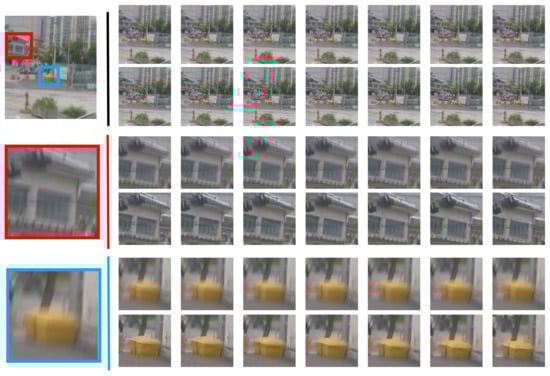Figure 4, Figure 5 and Figure 6 display three sets of exemplar results on the GoPro Database. Images in the first column on the left are the input motion-blurred images: the first of the three images is the original blurred image, and the next two images show details of the first picture framed by color boxes. The following columns on the right side of the vertical line are the shape frames generated by Jin et al. [] and ours. Please note that the upper row has the results of [], and bottom row corresponds to the proposed model. It can be clearly seen in the details of Figure 4 that the edge contours of the car and pillar are clearer in the sharp video sequence generated by our method. In Figure 5, the sharp video sequence generated by [] has a pronounced sense of graininess. From the comparison of Figure 6, it can be seen that the details of the window and the edge of the yellow box are sharpened more in our sharp video sequence than that of []. In general, through the qualitative comparison in Figure 4, Figure 5 and Figure 6, the results of our model’s deblurring are obviously more photo-realistic than those of [].