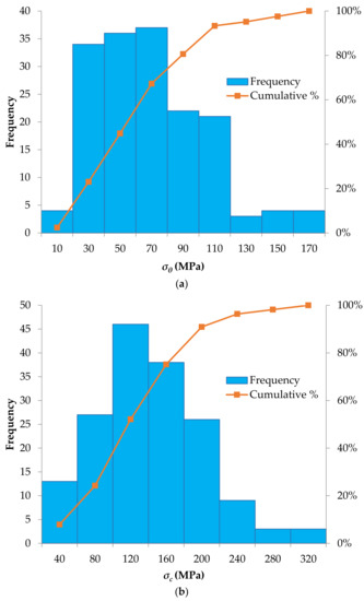The database contains maximum tangential stress of surrounding rock σθ (MPa), uniaxial compressive strength σc (MPa), uniaxial tensile strength σt (MPa), and strain energy storage index Wet. The histograms, cumulative distribution functions and descriptive statistics (such as minimum and maximum values, mean and standard deviations) of the selected rockburst parameters with the established J48 and random tree models are provided in Figure 2 and Table 3 (the complete database is available in Appendix A, Table A1). It should be noted that in ranges with more dense data, the established models are more accurate.