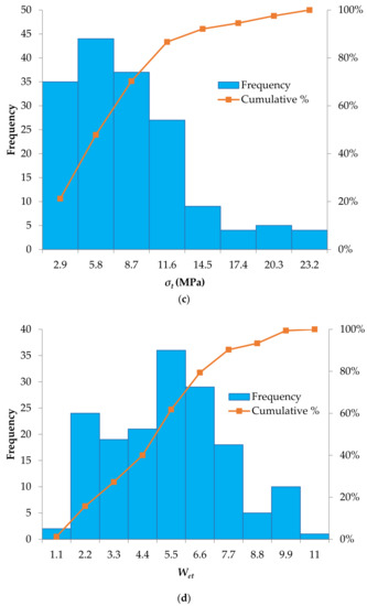 Histograms of the input parameters considered to predict the rockburst hazard: (a) Maximum tangential stress of surrounding rock (σθ; MPa), (b) Uniaxial compressive strength, (σc; MPa), (c) Uniaxial tensile strength (σt; MPa), (d) Strain energy storage index (Wet).