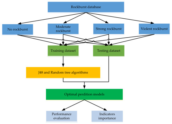 In underground mining and civil engineering projects, models for predicting rockburst can be valuable tools. This study compared J48 and random tree models for predicting rockburst. Four variables (σθ, σc, σt, and Wet) were selected as influence factors for predicting rockburst using a dataset of 165 rockburst events compiled from recent published research, which was used to construct the decision tree models. The following conclusions can be drawn, based on the results of the study: