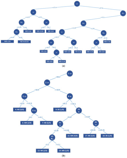 Although existing models such as SVM do not provide explicit equations for professionals, the established J48 and random tree models (see Figure 4) can be used by civil and mining engineering professionals with the aid of a spreadsheet to analyze potential rockburst events without going into the complexities of model development. Furthermore, the J48 and random tree approaches do not require data normalization or scaling, which is an advantage over most other approaches.