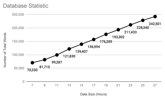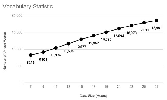 During the collection of the recordings, it can be observed that a vocabulary steadily increased at each hour-frame (Figure 1); however, starting from 15 h of data, the number of newly added words per hour decreased from 700 to 400 words. It is predicted that the number will reach stability at some point and after that, adding new transcriptions to the dataset will have less value in terms of vocabulary.