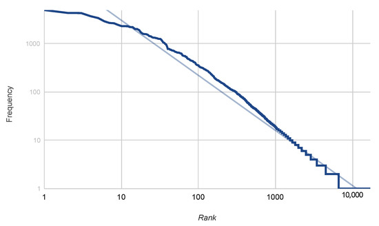 According to Zipf’s law, the plotting frequency of words in a large corpus against their rank in a log scale gives a straight line. It is worth knowing whether this corpus of dialogue system satisfied the law. Similar to the description in [22], Figure 3 depicts that the first part of the curve is unsmooth, the middle part is smoother and the last part—from 1000 to 10,000—is angled downward.