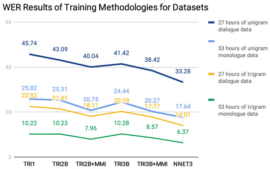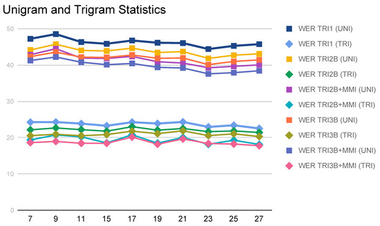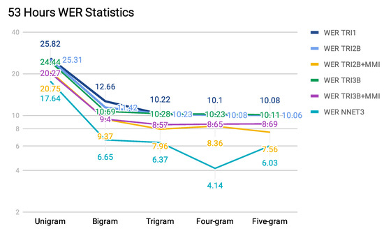 Additionally, to have a visual representation of differences of n-grams, WER results of all training methods were described for 27 and 53 h of data on Figure 7 and Figure 8, respectively.