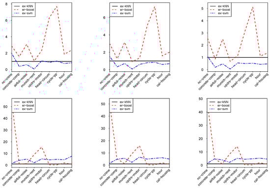 Test error ratio of er-boost and ex-svm to ex-(top) and computational time ratio of er-boost and ex-svm to ex- (bottom). The graphs comprise of (left), (middle) and (right).