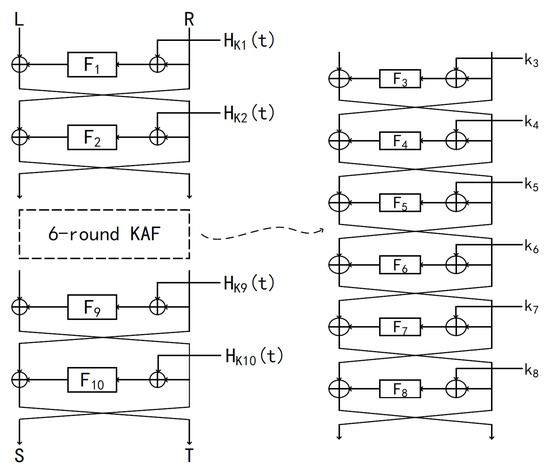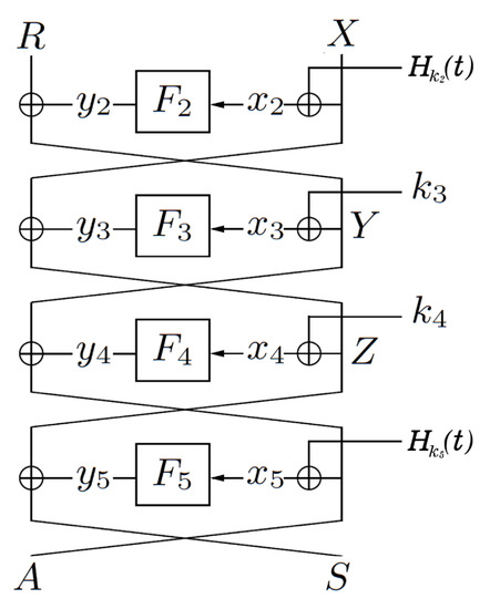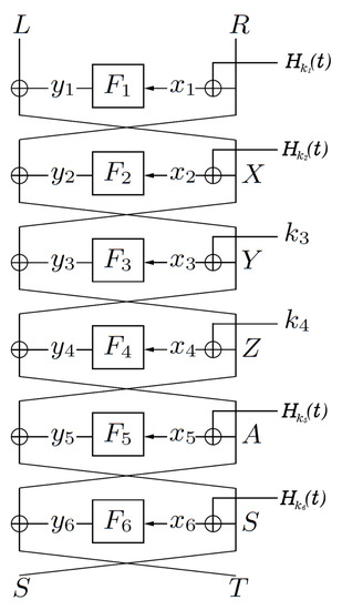 - Goldenberg, D.; Hohenberger, S.; Liskov, M.; Schwartz, E.C.; Seyalioglu, H. On tweaking luby-rackoff blockciphers. In Proceedings of the International Conference on the Theory and Application of Cryptology and Information Security, Kuching, Malaysia, 2–6 December 2007; Springer: Berlin/Heidelberg, Germany, 2007; pp. 342–356. [Google Scholar]