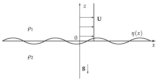 A shear flow with the tangential discontinuity of velocity plays an important role in hydrodynamics, despite the real wind profiles usually being nonuniform; they are often approximated by the logarithmic dependence of wind velocity with height. Nevertheless, a wind flow with the uniform profile plays an important role as it serves as the reference model in the study of the physical phenomena of wave–current interaction and for gaining insights into these complex areas (see []). This model is attractive because of its simplicity and richness of the effects. In particular, it can provide simple explanations of the concepts of negative energy waves (NEWs) [,], wave-induced currents [,], over reflection phenomenon [,,], etc. Furthermore, in the cases where the wavelength of the interfacial perturbations is much greater than the width of the shear flow profile, this model can describe physical phenomena adequately, at least within the limited spatial and temporal frameworks.