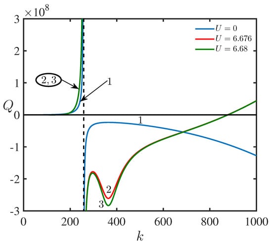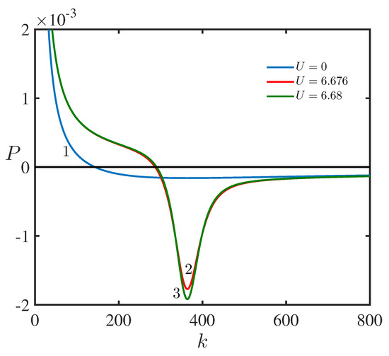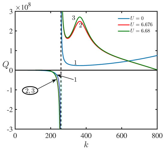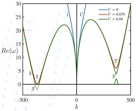 For , the dispersion curves become non-symmetric because of the wave drift caused by the flow. When U increases and becomes bigger than some critical value , the lower branch of the dispersion curve in Figure 2b changes sign and becomes positive for where