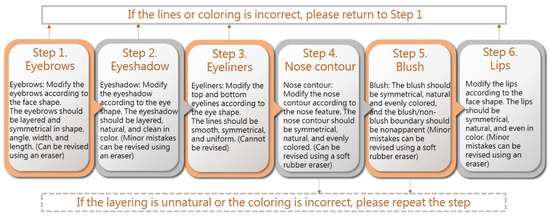 The research results were used to build a stroke database of Painter drawing tools for application in makeup design drawing and develop teaching models to improve the teaching of makeup design drawing. Based on the optimal drawing tool determined for each face part, the following model was established for using the optimal drawing tools (Figure 8).