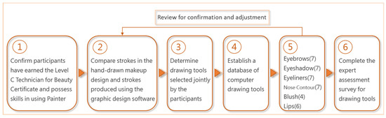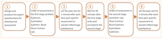 The second stage (Figure 3) involved the following. (1) We designed the expert assessment questionnaire survey regarding the drawing tools. (2) In the expert assessment survey, the 10 experts were asked to compare the stroke results in the makeup of each face part completed with the drawing tools selected by the 39 participants and rate each result according to its resemblance to the stroke in the corresponding part of the hand-drawn makeup design. The questionnaire was rated on a 7-point Likert scale, where a high score indicated a high level of resemblance. Face-part-specific assessment survey (pretest): The face-part-specific assessment survey began with the eyebrows and then considered the eyeshadow, eyeliners, nose contour, blush, lips. The experts ranked the strokes according to their resemblance to the hand-drawn strokes in the makeup design. (3) Prevention of afterimage interference: After the assessment for each face part ended, the experts were asked to look at a green Bristol board for 1 min to give their eyes a rest; this prevented interference from the afterimage of the previous assessment and reduced the mental workload of the experts. (4) The pretest was followed by a 60-min break before the posttest began. (5) Face-part-specific survey (posttest): the order of the face-part-specific assessments in the pretest was reversed in the posttest. The experts were asked to rank the strokes according to their resemblance to those in the hand-drawn makeup design. (6) After each face-part-specific assessment ended, the experts were asked to look at a green Bristol board for 1 min to give their eyes a rest; this prevented interference from the afterimage of the previous assessment and reduced the mental workload of the experts.