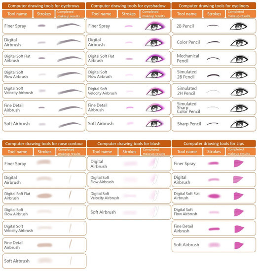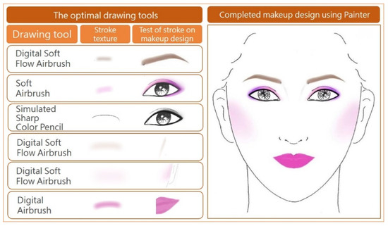 Graphic design software packages that produce strokes include Photoshop, InDesign, Illustrator, and Painter. The present study employed Painter software, the drawing logic of which is more suitable for makeup design and for makeup teaching and drawing. Furthermore, Painter features a realistic and natural brush stroke. Additionally, the software features digital copying and drawing functions to simulate natural effects. Designers can draw using simulated watercolors, oil painting, and chalk as materials to complete their digital design. By using a digital tablet, teachers can teach the various applications of each brush type according to the curriculum and also present various design materials and practices that otherwise cannot be done under conventional teaching methods. This enables students to better understand what is being taught. In the present study, teachers used Corel Painter to authentically present the effects of Western drawing media [27]. Currently, Painter has developed into an expansive toolbox providing a wide variety of presentation media. Designers can use the drawing function to present their unique innovations as media to express their passion for life [28,29]. However, before using the Painter brush simulation, students must familiarize themselves with the brush techniques in the learning process; test, compile, and adjust the parameters; and undergo training to become skilled in controlling the brush and become familiar with the feeling of drawing in the software. Painter use textures represent brush stroke. However, specific media usage with textures is not an easy task, and many designers need to adjust sensible parameters [30]. While the brush is being dragged and before it is released, then accumulate the stroke into a separate overlay texture. When the mouse is released, this overlay is blended with the image below in a process called merging. Merging follows the standard compositing rules [31]. Image editors often provide multiple parameters to customize the brush tool: diameter, hardness, opacity, flow [32].