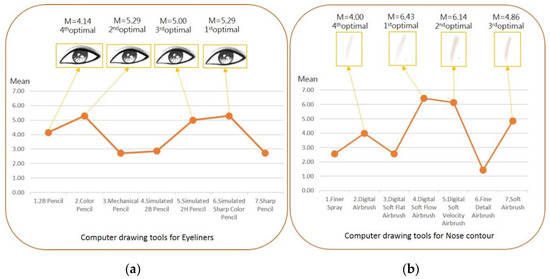 The optimal drawing tools rank list of computer drawing tools for (a) eyeliners and (b) nose contour.