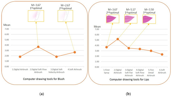 The optimal drawing tools rank list of computer drawing tools for (a) blush and (b) lips.