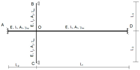 We have 2 coplanar reinforced concrete beams with different properties. AD beam is a main beam, considered double clamped at both ends, with the length L1 + L2. CB beam is a secondary beam, considered simply supported at both ends (nodes C and B), with length L3 + L3. The beams are made monolithically, so at point O of the intersection, a rigid knot is created. The secondary beam is arranged symmetrically to the main beam. The 2 beams have the Young’s moduli E1 and E2. The 2 beams have different sectional properties: for beam AD, we have the moment of inertia Iz1 and the area of section A1, and for beam CB, we have the moment of inertia Iz2 and the area of section A2, with the property that Iz1 > Iz2 and A1 > A2. The whole structure is presented in Figure 1.