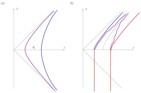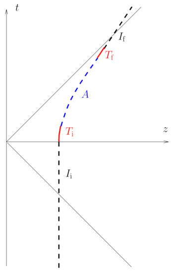 Arguments against this interpretation were put forward since the very beginning by researchers such as Born [20] and Pauli [21]. Many other such as von Laue [22], and later Hill [33] and Feynman [27], subscribed and elaborated on these arguments. Essentially, on the one hand, there is Pauli’s argument. It is based on the fact that, on the hypersurface , where the hyperbolic trajectory passes through its point of zero velocity, the magnetic field vanishes. Thus, it seems impossible to associate a wave zone and a non-vanishing Poynting vector to the process. The problem with this argument appears to have been first identified by Drukey [34] and then further cleared up by Bondi, Gold and Spencer [26] and Fulton and Rohrlich [13]. The problem is that, to identify the radiation produced at a point of the trajectory, one has to analyse the limit of large spheres within the causal lightcone . Only with the values of the magnetic field in one spacelike hypersurface one cannot know whether there is radiation or not at infinity. In geometrical language, one has to analyse the structure of null infinity and not of spatial infinity. On the other hand, Born’s argument is based on the conformal invariance of Maxwell’s equations: if there is no radiation when a particle is at rest, there cannot be radiation when the particle is uniformly accelerating, as this movement can be attained by a special conformal transformation. The problem with Born’s argument is that he was using, without realising it, not just the retarded fields of a single charge but a combination of half-advanced plus half-retarded fields associated with two mirror charges. This field combination indeed does not lead to radiation at infinity. However, this field solution does not represent the physical situation one is interested in. In fact, this field solution is the result of applying a special conformal transformation to the Coulomb field of a particle at rest [13,25,35]. Against the conformal invariance argument, we could say that the particular solution, one single accelerated charge with just retarded potentials, spontaneously breaks conformal invariance.