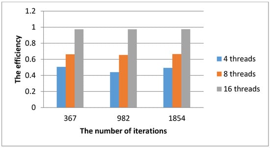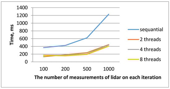 Then we give the results of the proposed parallel algorithm. To visualize the results, the dependencies and diagrams of the display of achieved efficiency and acceleration will be depicted. Table 1 and Table 2 show the results of performance of iterations with parallelized data at different amounts of measurement of the lidar at 4-core and 8-core processors. Figure 8 shows a graph of the dependence of the time of execution of a parallel algorithm from various measurements of the lidar at the 8-core processor in variation in the number of threads. These measurements mean how many rays the lidar emits. It should be noted that the more of these rays, the more precisely determines the current position of the lidar. That is, at 100 dimensions, the algorithm works faster, but issues a fairly large inclination. It is also necessary to take into account that if the number of such measurements will be more than 500, then the error will be minimal. If you take into account 1000 measurements, then the error will be almost the same as at 500, but the time on the calculation will be exposed more. It should also be taken into account that the number of such measurements of the lidar depends on the area of the room, that is, it is larger, the more necessary rays to save an error. Then the usual sequential algorithm can be long or calculations will be too large to fit in RAM. Denote —time of sequential algorithm, a —the time of parallel algorithm, —the number of iterations, —the number of measurements of lidar on each iteration, —parallel acceleration, —efficiency.