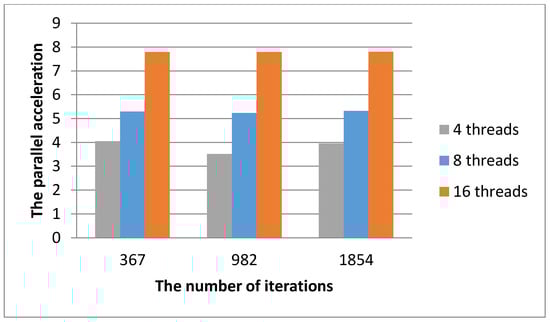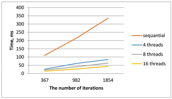 Regarding the general results of our algorithm, it is noticeable that the results of a sequential algorithm and results obtained during comprehensive work on the parallelization of the algorithm for determining the current position of the lidar are significantly different. Most of our results were obtained by parallelizing according to the data from our decades. As a result, it was possible to achieve efficiency ~0.97 (with 16 flows on the 8-core processor for 1854 iterations). It is already evident from the schedules of the dependence of the time of parallel execution that for the 8-core processor, the time of execution of a sequential algorithm and paralleled begins to be rapidly different from the 367th iteration.
