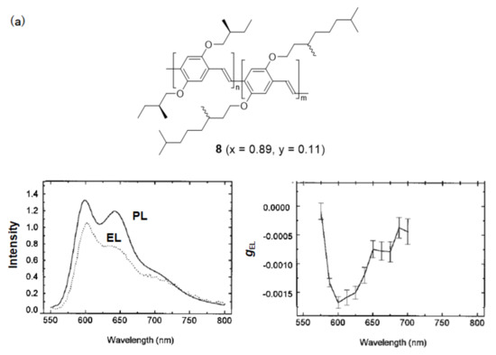 The first CP EL device was reported by Meijer and coworkers in 1997 [47], as shown in Figure 5a. They synthesized poly(p-phenylenevinylene) derivative 8 bearing chiral alkyl chains and fabricated EL devices, including light-emitting layer of the conjugated polymers with a thickness of 300 nm by a spin-coating method. The ge value was 1.7 × 10−3 at 600 nm. They improved the ge value to 0.35 in an EL device with a thickness of 70 nm using a nonafluorene derivative bearing chiral alkyl chains [48].