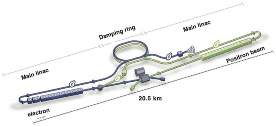 At the ILC, an electron beam accelerated along a straight line to energy of 125 GeV collides head-on with a positron beam similarly accelerated in the opposite direction, resulting in collision energy of 250 GeV. Each beam consists of 5 trains per second (i.e., the “repetition rate” is 5 Hz) where one train is roughly 1 ms long consisting of 1312 bunches. One bunch contains 2 × 1010 particles and its size (rms) at the collision point is 7.7 nm high, 516 nm wide, and 300 µm long; namely, it is ribbon-like—very flat and long. A schematic drawing of the machine is shown in Figure 1.