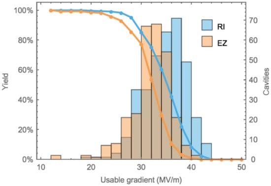 Maximum gradient and yield of ‘as received’ cavities produced for the European X-ray Free Electron Laser (E-XFEL) by two vendors [11]. Vendor RI employs a production process that closely follows the ILC specification.