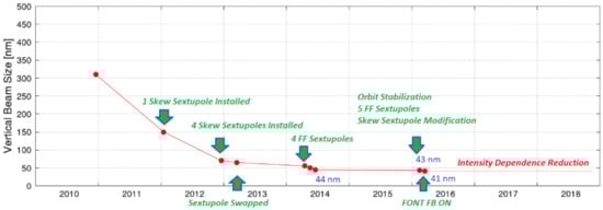 The achieved vertical beam size at ATF2 facility [9]. The latest value of 41 nm is within 10% of the goal of 37 nm.